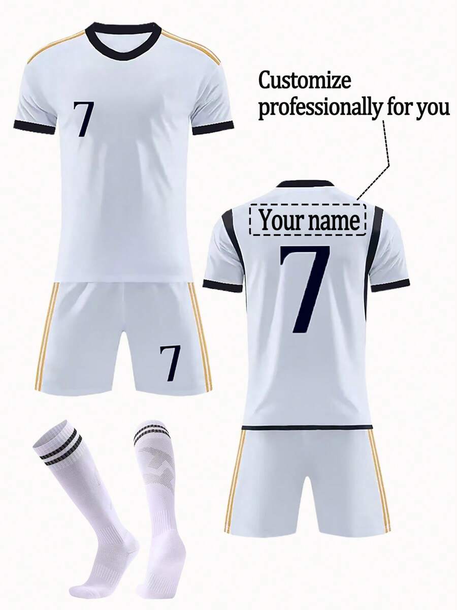 2pcs Customized Name Youth Soccer Jersey Set - Classic White #7, Round Neck Short Sleeve Shirt And Shorts, Polyester, Suitable For Sports, Training And Casual Wear, Outdoor Perfect Choice