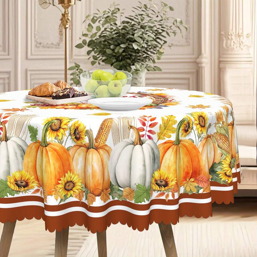 1pc Autumn Thanksgiving Tablecloth - Harvest Theme Pumpkin & Corn Pattern - Washable Polyester Dining Table Cover, Suitable For Farmhouse, Thanksgiving - For Rectangular & Round Tables - Easy Care Decor, Holiday Home Accents, Durable Material, Rustic Style, Hassle-Free, Perfect For Family Gatherings