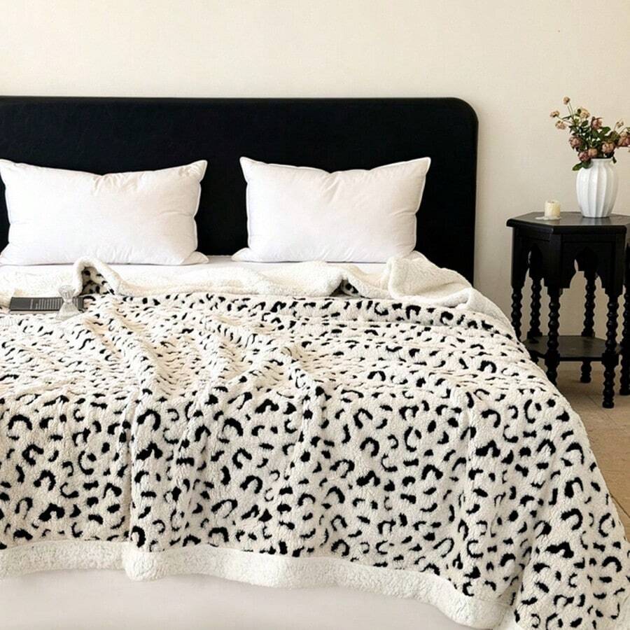 1pc Double-Layer Thick Jacquard Taffeta Fleece Blanket, Leopard Print Plush Throw Blanket