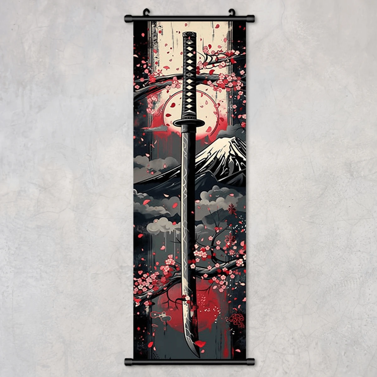 1pc Extra Large Katana & Cherry Blossoms Wall Art - Vibrant Red Sun Scroll Painting, Anime-Inspired Canvas Poster With Or Without Frame - Modern Japanese Decor For Indoor/Outdoor, Vertical Hanging Scroll Poster, Kawaii Room Decor