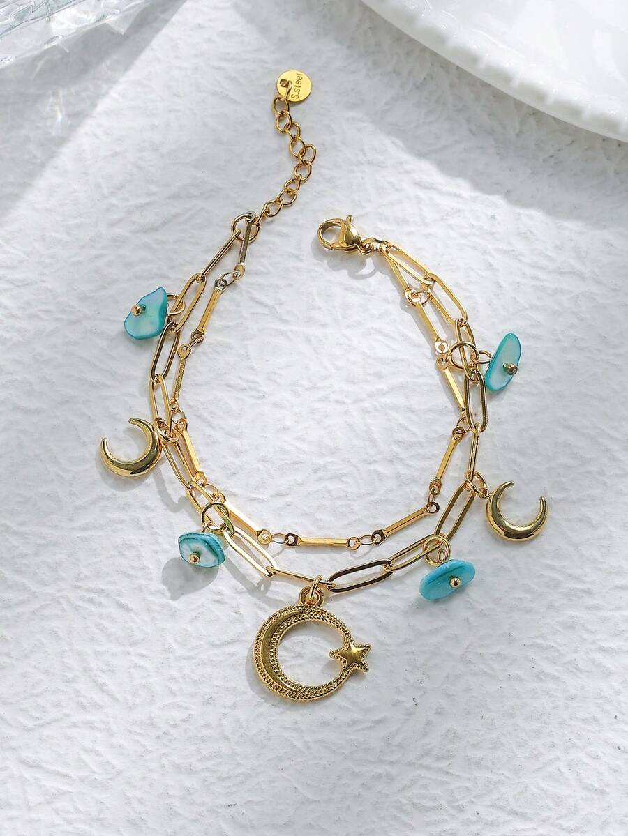 1pc Y2K Funky Stainless Steel Moon Charms Bracelet 18K Gold Plated Double Layer Chain Cuff Jewelry For Women Teen For Daily Decoration & Friendship Gift
