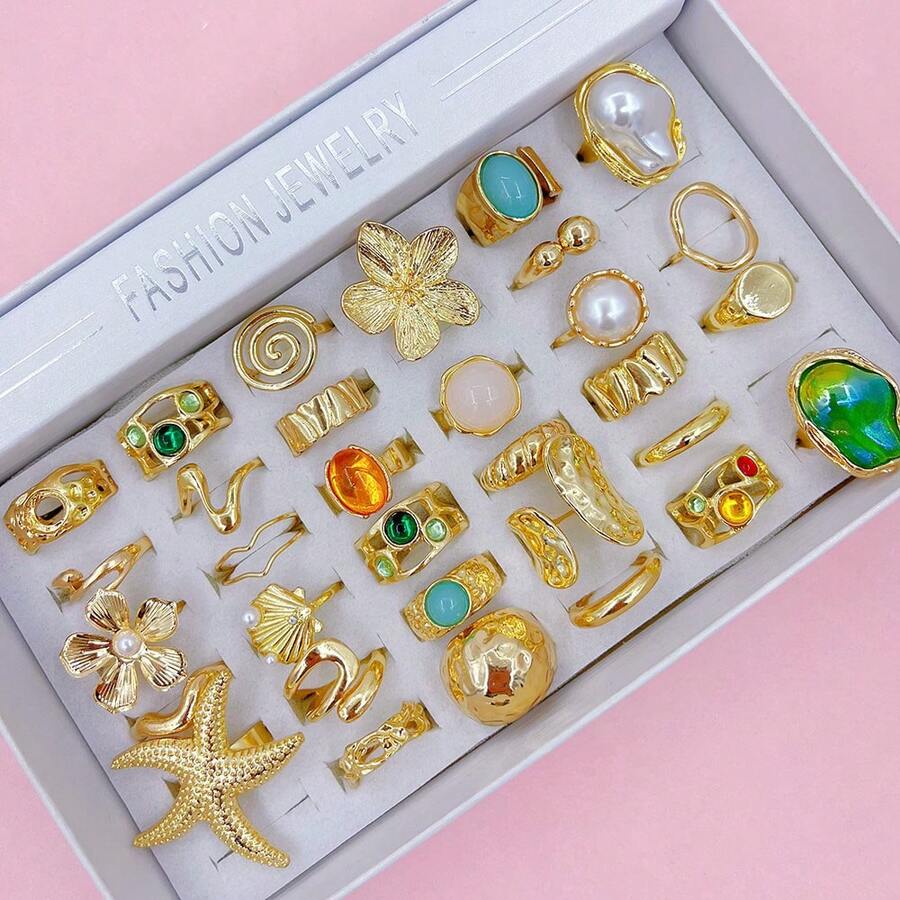 20pcs/Pack Luxury Faux Pearl Inlaid Alloy Women's Ring Set, Elegant Exaggerated Flower & Starfish Mixed Styles, Multi-Piece Open Adjustable Rings For Party, Wedding, Daily Wear, Fashion Jewelry Gift, Random Assortment