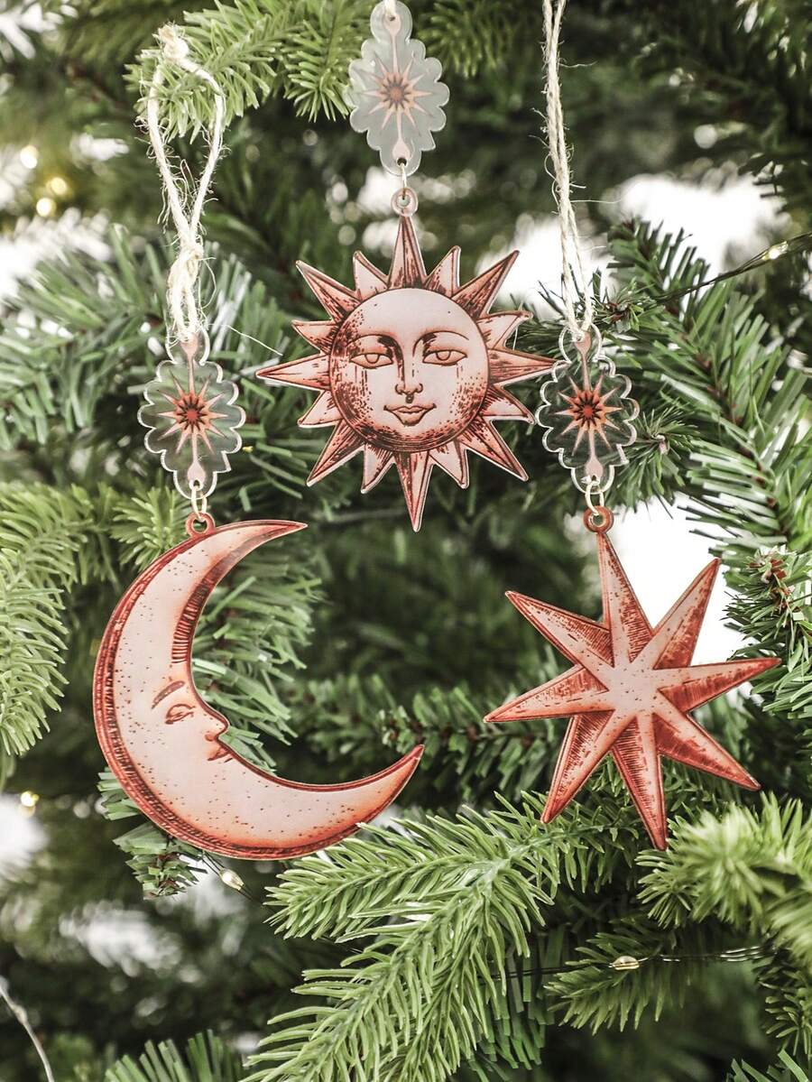 3pcs Vintage Sun, Moon, Star & Christmas Tree Decor, Bohemian Gothic Witch Aesthetic Christmas Decoration, Retro Sun Face, Crescent Moon, Star Ornaments, Suitable For Solstice, Holiday Parties, Home, Bedroom, Living Room, Office, Seasonal Decor (Please Remove Protective Film Before Use, Acrylic Material, Not Glass)