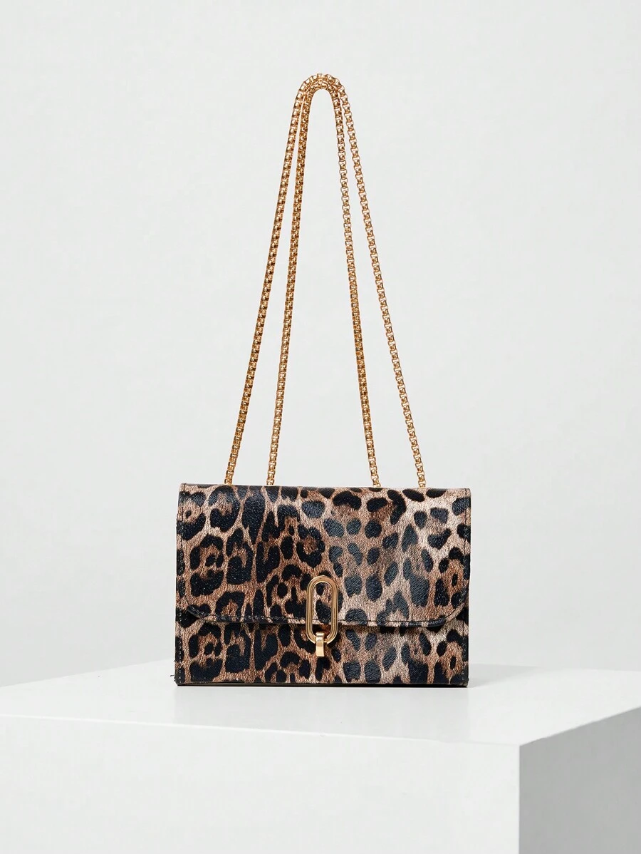 A Retro Fashion Leopard Print Mini Square Bag With Flap Opening, Metal Double Chain Shoulder Bag, Adjustable To Crossbody Bag, Suitable For Women's Daily And Students' Casual Use, Leopard Print Bag