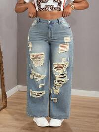 EMERY ROSE CURVEPlus Size Straight Leg Denim Jeans With Button And Pockets, Medium Stretch Fabric, Long Length. Casual, Versatile, Streetwear Style, Solid Color, Distressed Wash, Suitable For Daily, Vacation, Formal, Travel, Back To School, Easter, Pride Month (US), All Seasons Spring #4 Bestseller