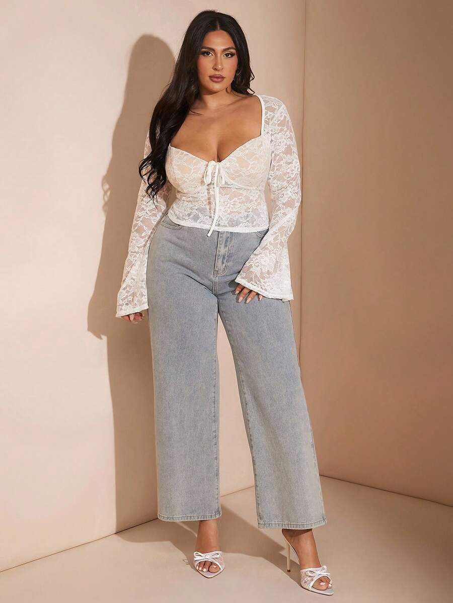 SHEIN BAE Plus Size Women's Sexy Sheer Lace Long Flare Sleeve Blouse, Women Top/ Plus Size Lace Top/ Lace Undershirt Long Sleeve/Wedding Guest Dress Curve/Fall Clothes Plus Size/Halloween/Homecoming/Christmas/Going Out /Birthday Top For Women/Western Wear Women/Dresses For Women Party/Women's Fall Clothes/White Top Classy Elegant,Fall Clothes For Women