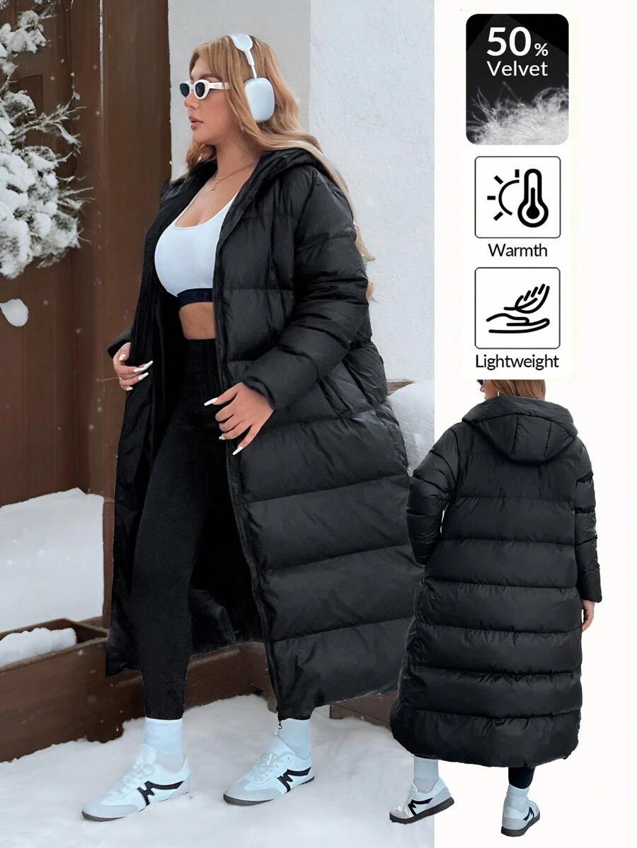 SHEIN EZwear Plus Size Women's Solid Color Long Sleeve Hooded Long Coat, Winter