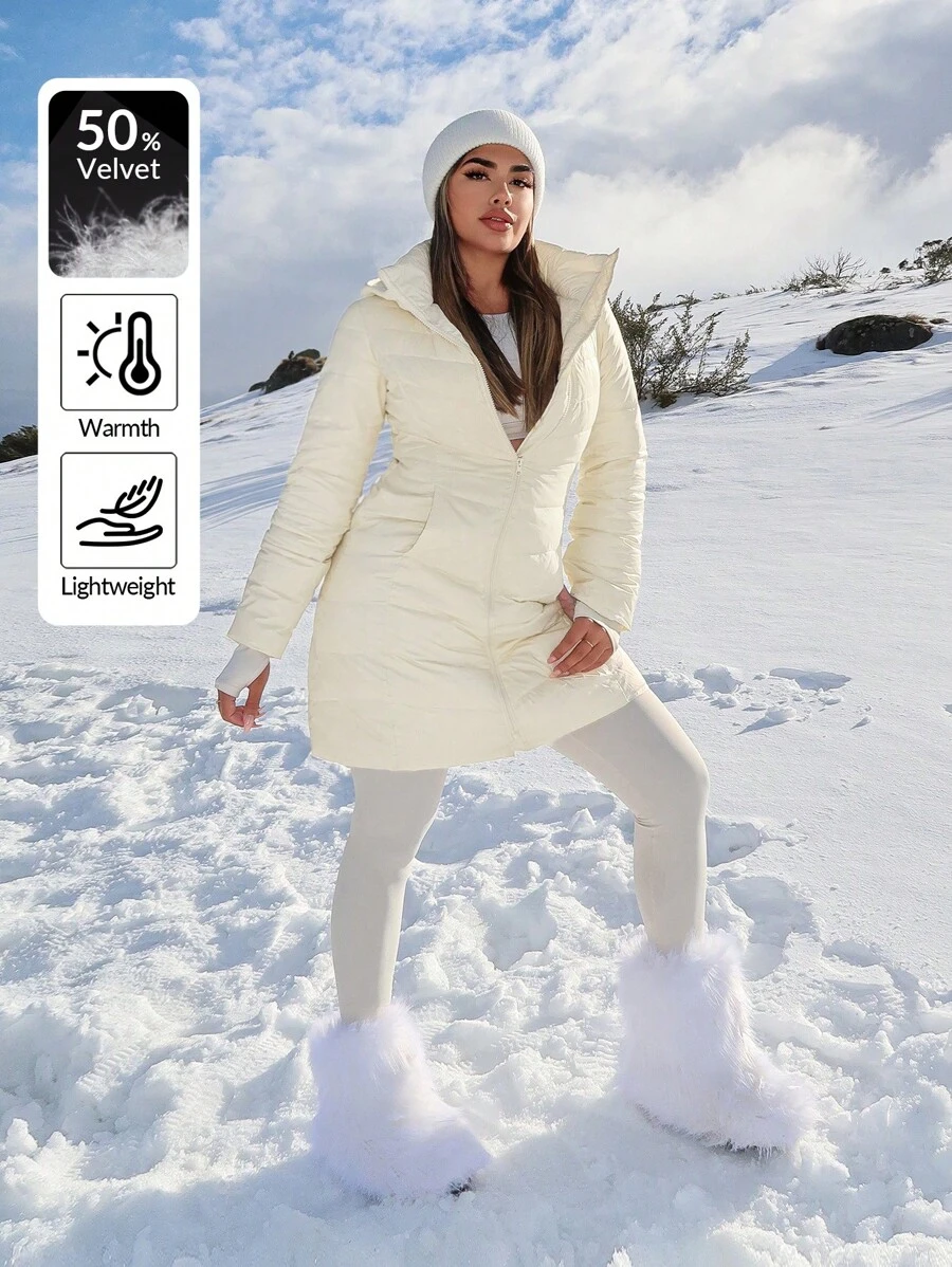 SHEIN SXY Plus Size Women's Winter Long Sleeve Zip Front Casual Hooded Down& Feathers