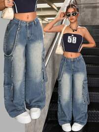 SHEIN SLAYR KIDSSHEIN Coolane Teen Girls Cargo Rapper Washed Grunge Low Rised Baggy Wide Leg Jeans, Flap Pocket Cargo Jeans,Fall Winter Cargo Pants Back To School, Vintage, Fall Girl Clothes, Streetwear,90S Punk Goth Streetwear Outfits,Girls Halloween Costume Outfits, Baggy Jeans Y2k, Oversized Jeans, Washed Denim Jeans,Halloween Costumes Women #8 Bestseller