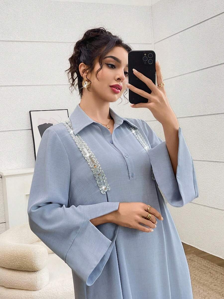 Yasmyna Women's Sequin Patchwork Long Sleeve Loose Arabic Style Dress Sequin Fall Women Clothes Traditional Arab Clothing Blue Dress