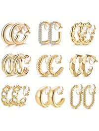 Xiacheng 4-9 Pairs Gold Clip On Earrings 14K Gold Plated Chunky Hoop Clip Earrings Clip On Hoop Earrings For Women Non-Pierced Fake Jewelry
