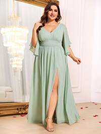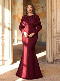 SHEIN Belle Women's Plus Elegant Stretchy Korean Net Yarn Fabric Dress With Draped Collar, Batwing Sleeves, Ruched Detailing, Asymmetric Ruffle Hem With High Slit To Thigh, Rhinestone Button Decor, Suitable For Weddings, Mother's Day, Back To School, Music Festivals, Formal Plus Size Bridesmaid Gown, Wedding Event Dress #9 Bestseller
