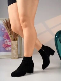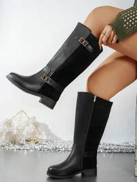 Serener-VPlus Size Women's Autumn/Winter Leather + Suede Patchwork Side Zipper Fashion Riding Boots, Metal Buckle Decor Adds Sophistication, Shaft Height Flatters Leg Lines, Side Zipper Single-Hand Wear & No Chafing, Thermal Lined Keeps Warm & Comfortable In Winter, Classic Nude Color Versatile & Timeless, Suitable For Commuting, Dates, Travel Photos, Can Be Paired With Various Outfits,Party Wide Fit