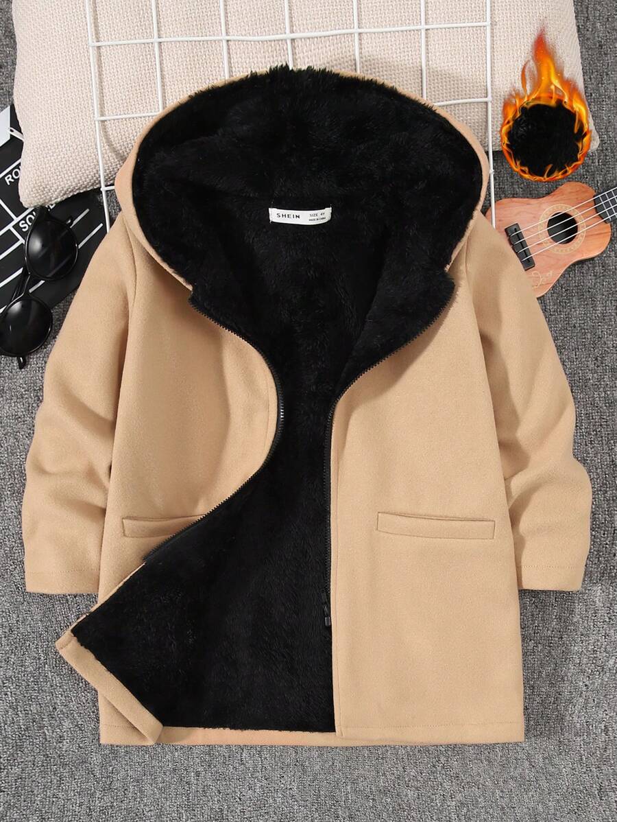 SHEIN Young Boy Hooded Solid Color Overcoat With Plush Lining And Colorblock Design, Winter